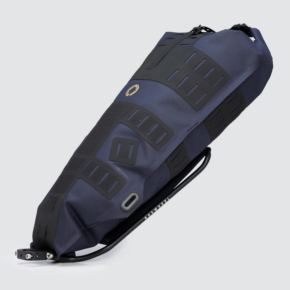 The most versatile bag in the range, this large dry bag with a steep tapering body allows very easy access to a large load. The M.O.L.L.E. inspired attachments and the rack, ensures this large bag fits securely and has zero ‘sway’. Other gear and packs can be added externally and underneath the rack. The rack uses a lightweight but stable construction and is adaptable for different bike geometries.