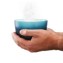 The bowl has a structured design that reduces heat transfer and can hold a gas cartridge (230 g screw cartridge) for transportation.