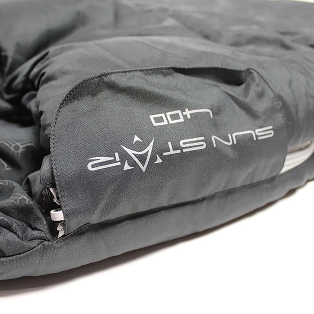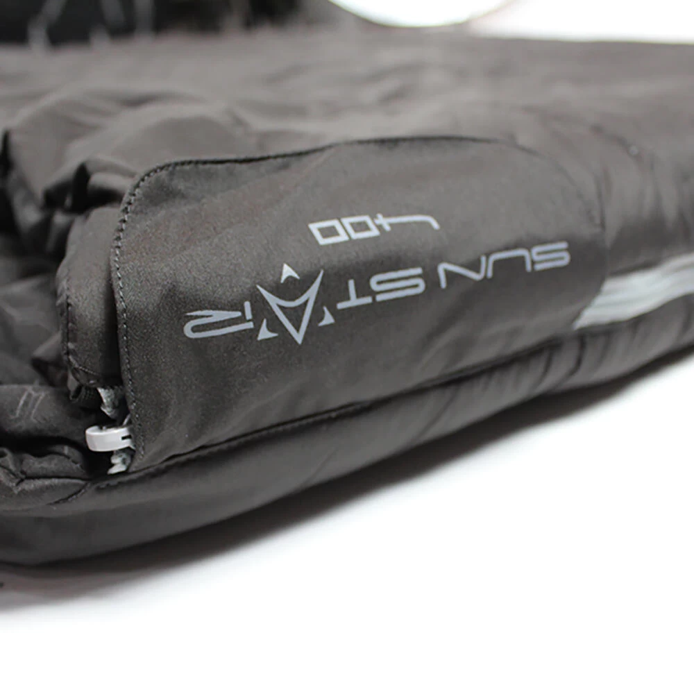 A heavier, 3 season weight double square sleeping bag with a cowl hood, and is perfectly suited for comfortable family camping in the UK and Europe from early Spring through to Mid-Autumn. This bag comes in both left and right-hand side zips which allow each user to exit the bag without disturbing the other. There is also a third zip at the base which allows extra ventilation around the foot area on those hot nights under canvas. The outer shell fabric feels soft and warm thanks to the micro polyester and the lining is also warm to touch thanks to the brushed embossed 190T polyester. All round the Sun Star Double 400 is an excellent heavier weight mid level sleeping bag that has not compromised on quality or features and will give the users many years of comfort and pleasure. Pack Size 50 x 48 x 22cm • Filling: 2x200g/m2 double layer 30% single hole siliconized hollow fibre / 70% polyester fill